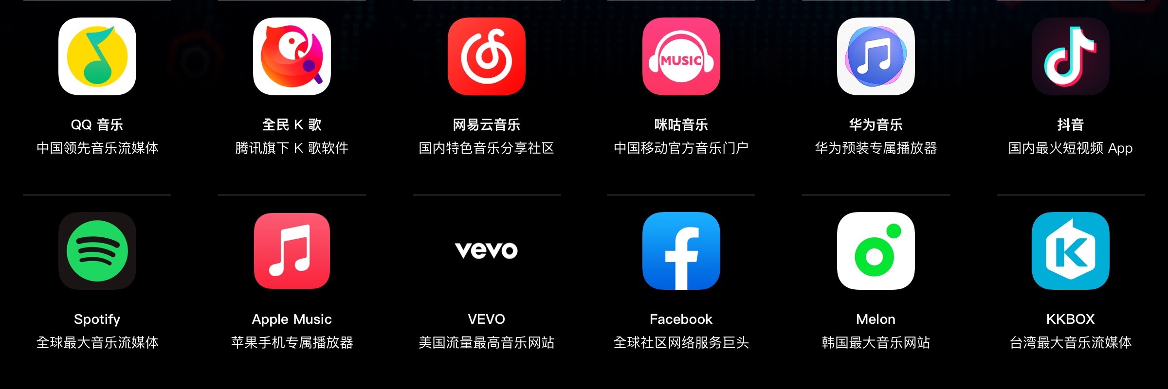 覆盖150+全球主流音乐平台,让你的音乐传遍世界每个角落。从流媒体到下载商店,从社交媒体到短视频平台,一站式发行解决方案。